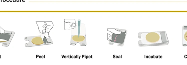 Each single-use microbial test contains prepared media in a shallow dish with an adhesive top cover. To plate a food or water sample, peel up the adhesive to expose the media, pipette 1mL for standard plates and 5mL for high-volume plates into the center of the plate, watch the sample wick and spread into the media. The test gels solidify within 10 seconds (30 seconds for High Volume test). Plates are designed for uniform heat and air flow and with an air space above growth to allow opening and picking of growth for additional microbiological procedures and identification.