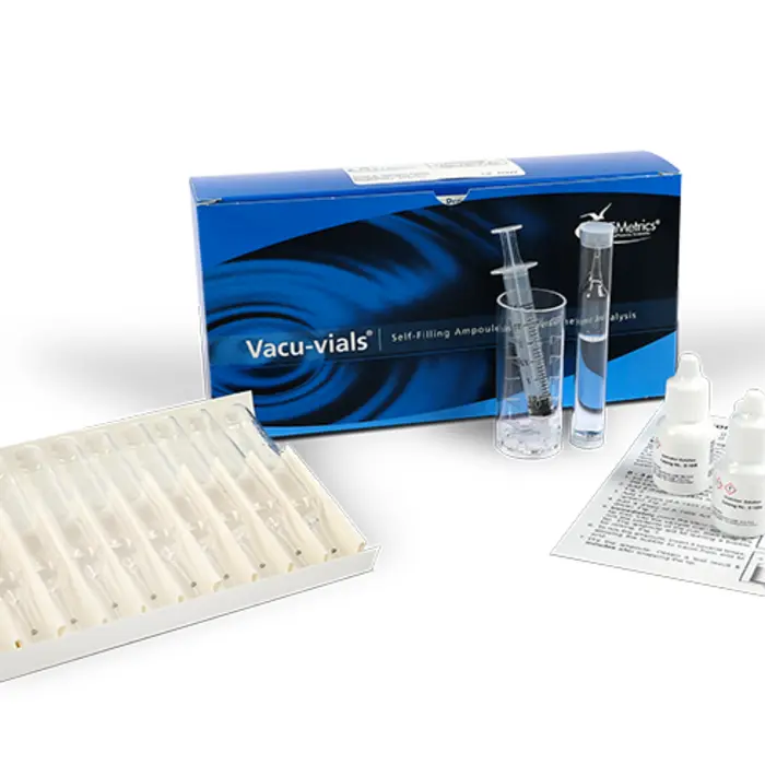 Vacu-Vials kits are instrumental kits that come in a cardboard box and contains everything needed to perform 30 tests (except distilled water): 30 ampules, Stabilizer Solution, Catalyzer Solution, Activator Solution, 25mL sample cup, 3mL syringe, ampoule blank, and instructions. These kits require the use of the V-3000 photometer or a spectrophotometer capable of accepting a 13mm diameter round cell (sold separately).