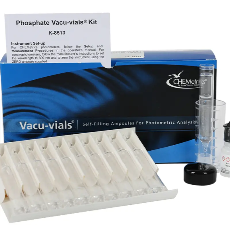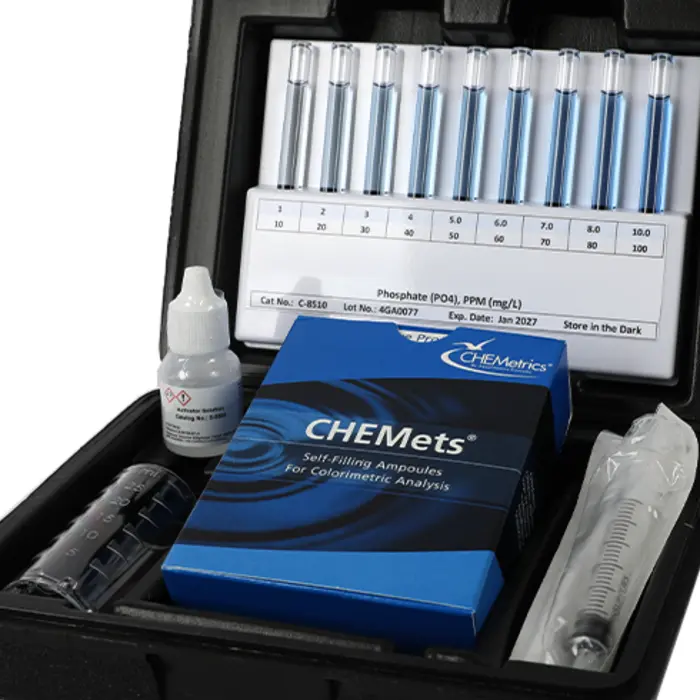 CHEMetrics Phosphate Test Kits measure ortho (reactive) phosphate using two different methods: Stannous Chloride and Vanadomolybdophosphoric Acid. Visual and instrumental phosphate test kit formats that span low and high measurement ranges are offered.