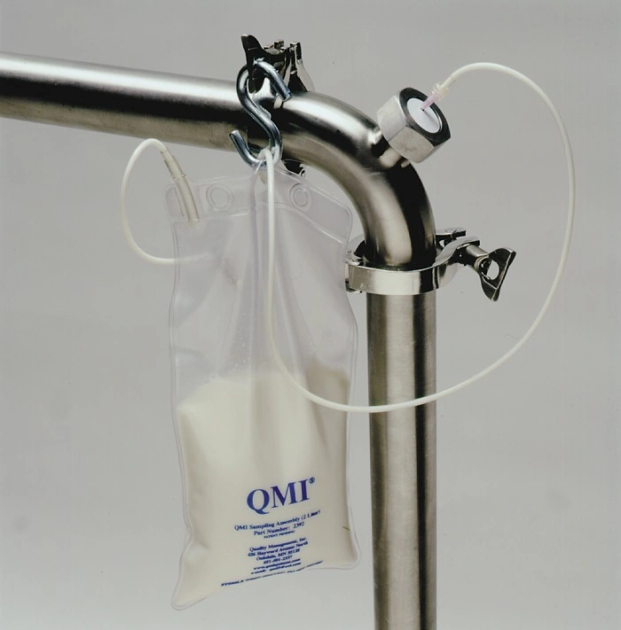 Line sampling has been effectively used for a number of years by dairy processors as a method of identifying sources of contamination. Samples from HTST (High-Temperature Short-Time), product storage tanks and lines prior to the fillers have been routinely analyzed. However accurate testing of HTST samples has been difficult because of small sample size, sampling timing and low oxygen levels in the milk. A composite sampling bag, incorporated into the QualiTru aseptic sampling system, has proven to be effective. This sterile bag has tubing and a needle attached which allows a sample to be taken over a 5-10 minute time period.