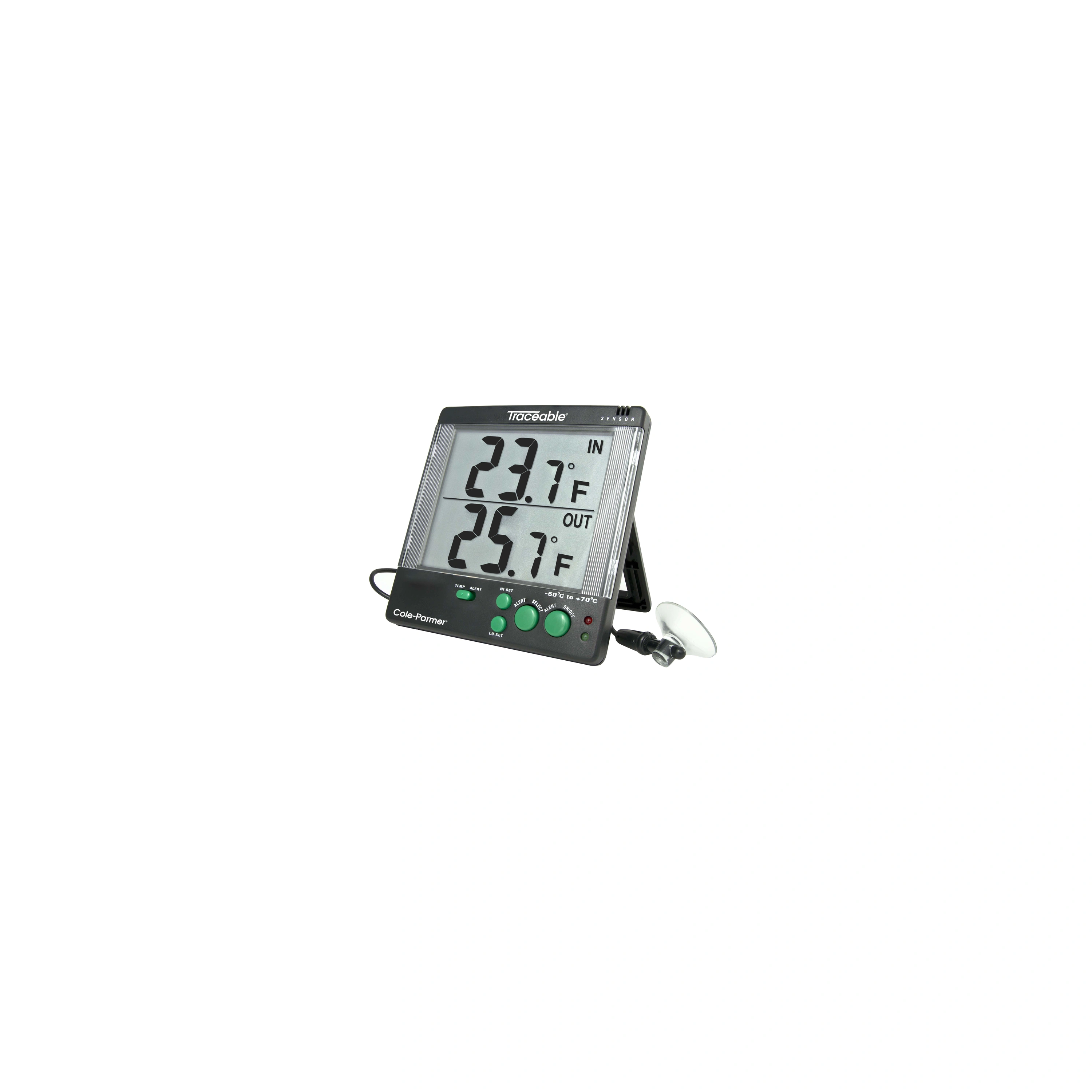 The Digital Lab Thermometers with Temperature Alert uses both audio and visual cues to show results. It is designed to show both in and out temperature. A temperature alert sets off an alarm and causes an LED to flash when the temperatures exceeds or decreases outside a set temperature range. This alarm sounds for five seconds every minute until the thermometer is turned off or conditions return to the specified range.