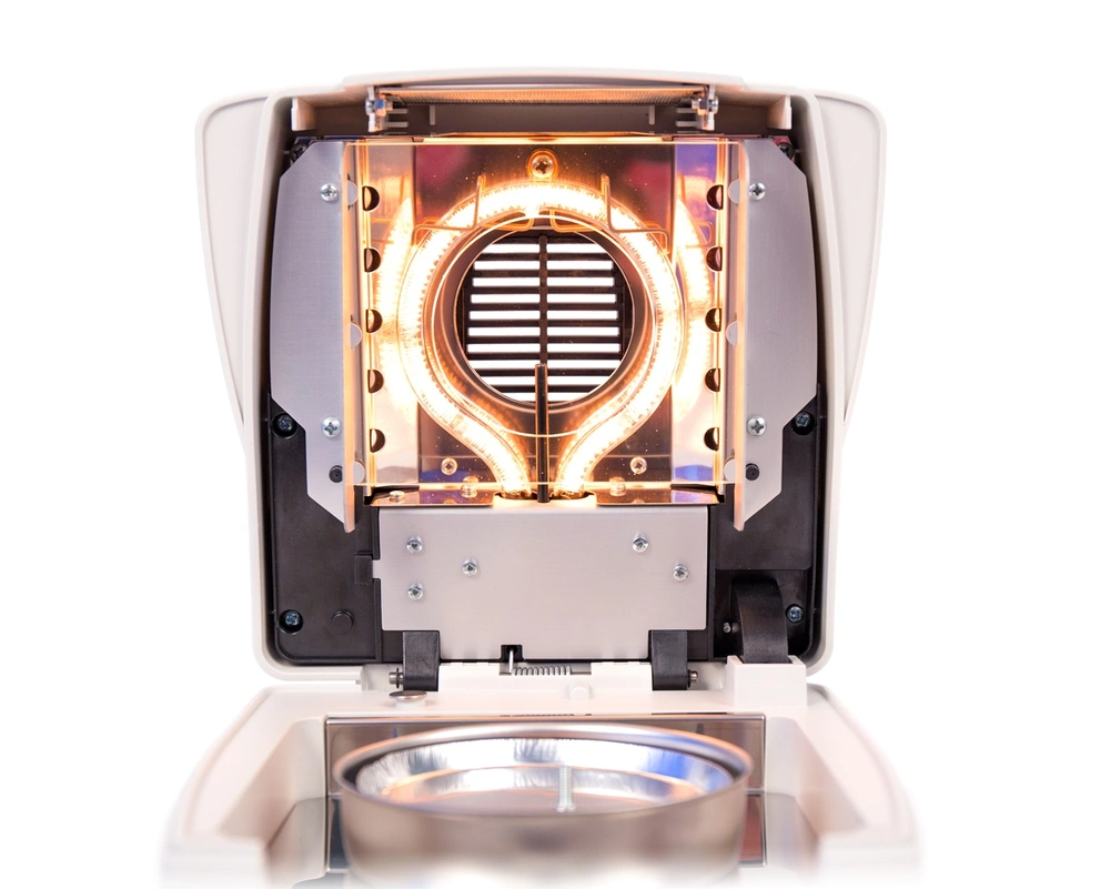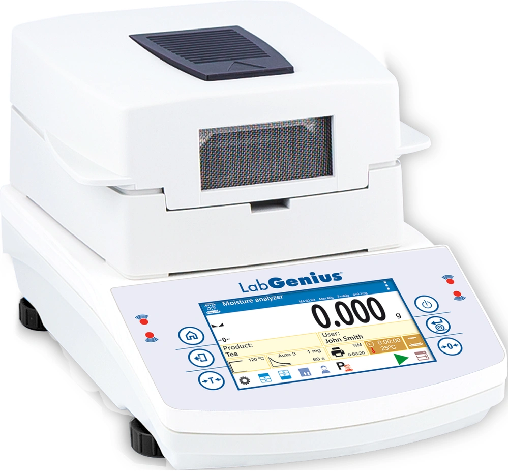 - Allows for customization of switch-off times for end of moisture content analysis (automatic, time-defined, or manual switch-off)
