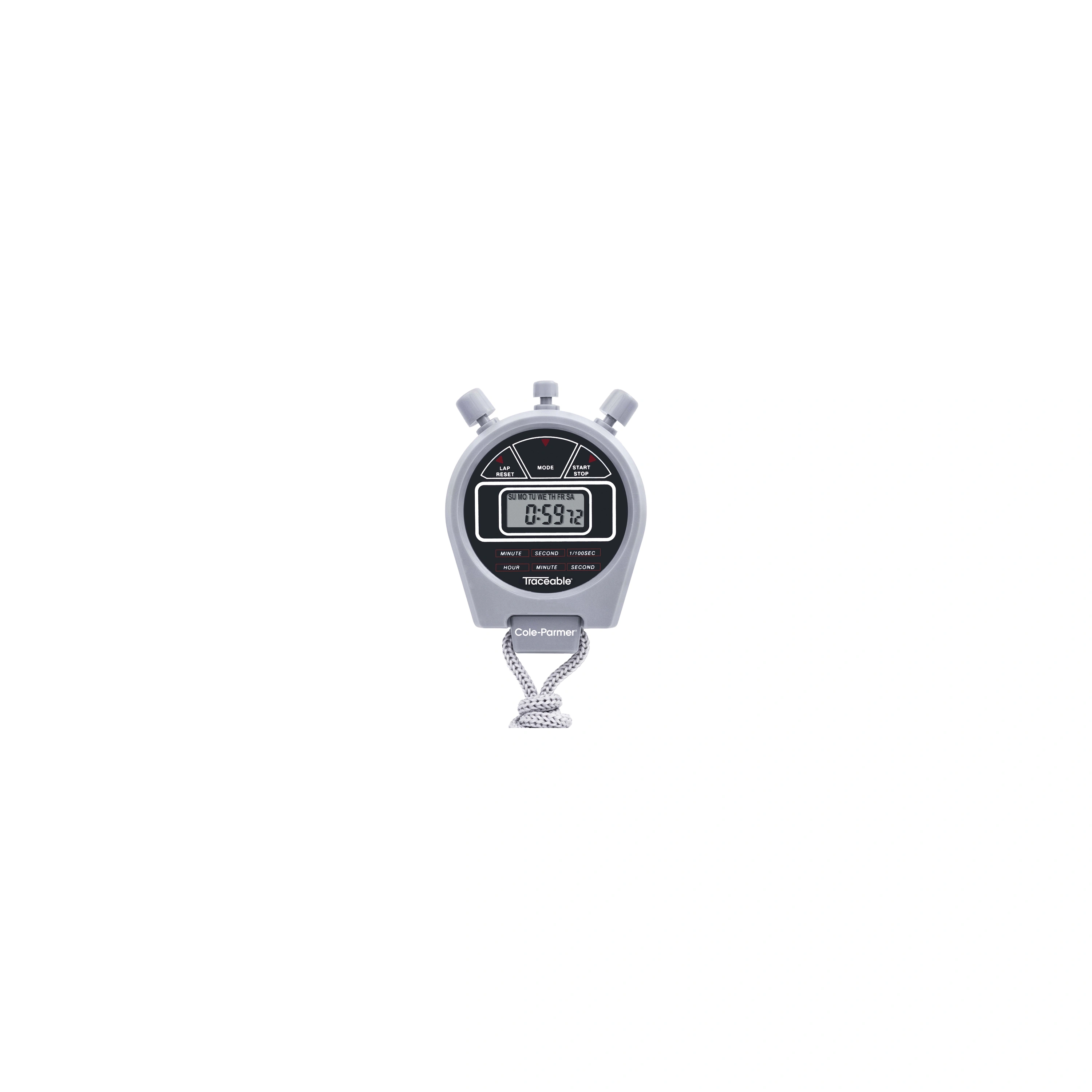 This stopwatch is suitable for occasional use where high-precision timing is not a requirement. It is supplied with a Traceable certificate provided by an ISO 17025 calibration laboratory accredited by A2LA, which indicates traceability to standards provided by the National Institute of Standards and Traceability (NIST). It also comes with a one-year battery and 38" lanyard.
