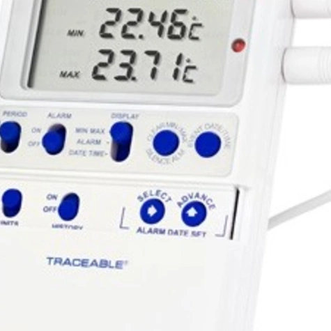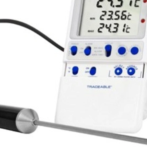Traceable Platinum High-Accuracy Thermometers display the minimum/maximum temperatures for last 24 hours (for each hour) and last 7-days (for each day); or for last 30 days (for each day). The time/date stamp key shows the exact time and date for all minimum and maximum readings. A 4-wire platinum sensor version ensures linear response and high accuracy across the entire range while the sealed bottle probe version is insulted from rapid temperature changes when door is opened.