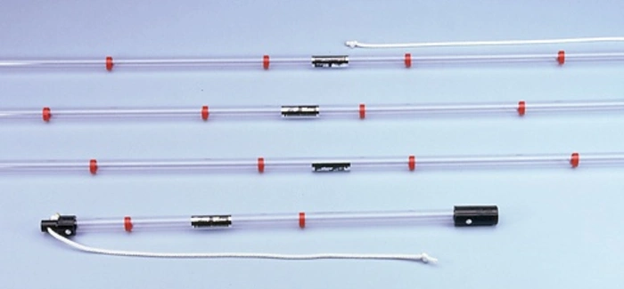 foot increments marked on the pipe sections. To release the material in the unit, touch the pin extending from the bottom section